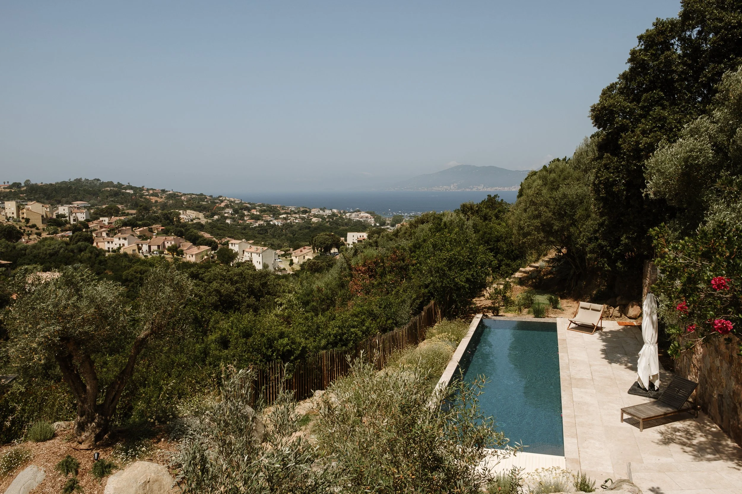 L’aménagement articule différents temps de vie : une piscine à débordement, bordée de pierres claires, s’ouvre sur la mer ; plus haut, une terrasse accueille jeux et réceptions, tandis qu’un terrain de pétanque ombragé et des cheminements discrets invitent à la promenade. Les matériaux bruts — pierre locale et bois — s’intègrent naturellement au site.Dans cet écrin de verdure, chaque espace trouve sa juste place, au rythme du terrain et du paysage environnant.